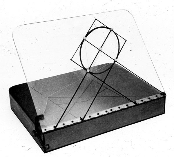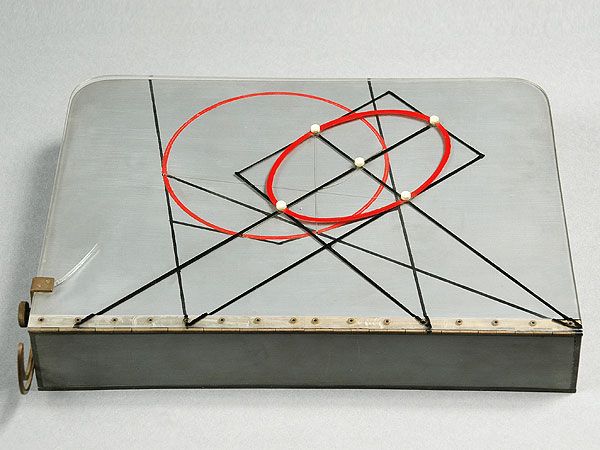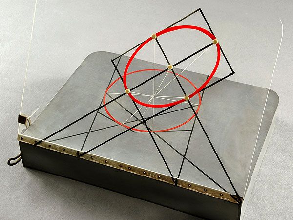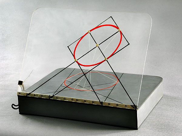 The model shows that in the case of a perspective mapping of two planes (who can be revolved one onto the other) the uniting lines of corresponding points all go through one point, the centre of perspectivity. In the model the perspective mapping of a circle into an ellipse is represented.