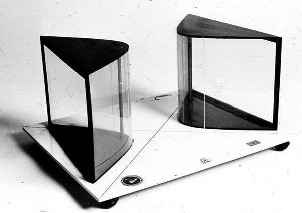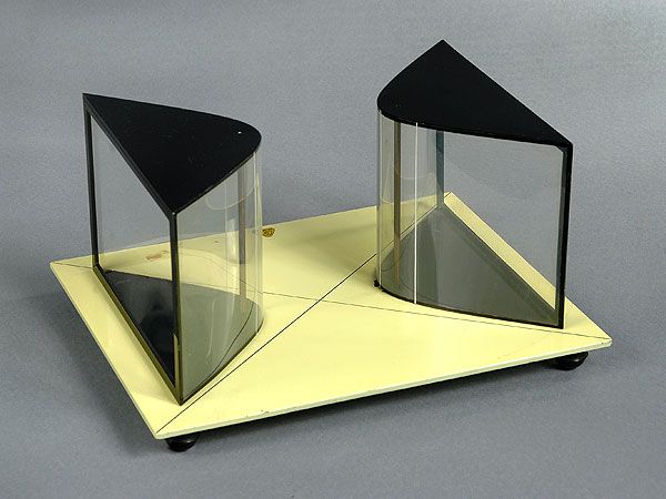 If the directrix of a cylinder a conic section ( a curve of the second order, here a hyperbola), the surface of a quadric (a surface of the second order) The model shows a straight hyperbolic cylinder, which means the surface lines are normal to the the carrier plane of the directrix. On the base the asymptote of the hyperbola can be seen.