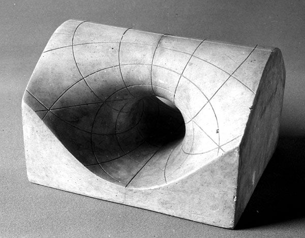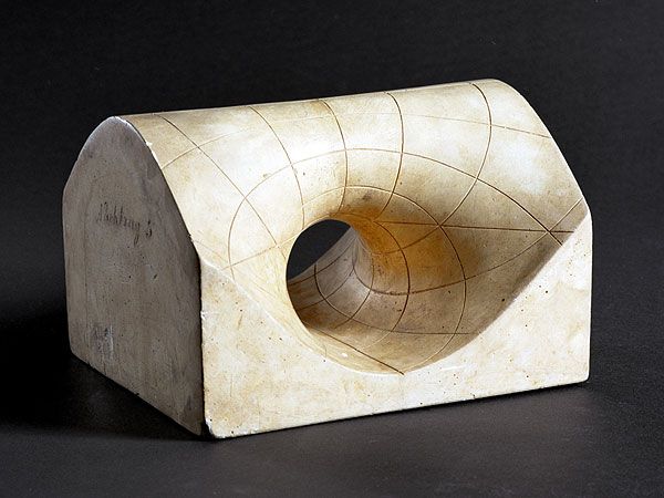 These parabolic ring cyclides have the remarkable feature, that it breaks down the 3-space in two congruent parts: The hollow form, that was used for the manufacturing of the plaster model, is congruent to the model.