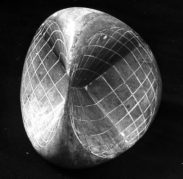 The Roman surface (so called because Jakob Steiner was in Rome when he thought of it) is a self-intersecting mapping of the real projective plane into three-dimensional space, with an unusually high degree of symmetry. This mapping is not an immersion of the projective plane; however the figure resulting from removing six singular points is one.