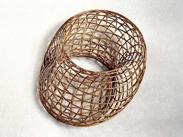 The model shows a general circular shear surface. Sections of circular shear surfaces are used as cambered surfaces. The surface is of fourth order and contains a hyperbolic double curve along which the two mirror-symmetric halves of the surface are joined. The real part of the double curve is bounded by uniplanar pinch points.