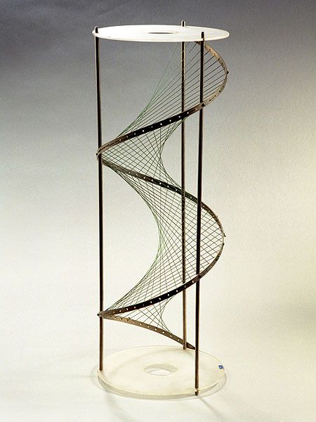 The model shows a part of the so-called "sharp screw" or "corkscrew surface". The generating lines intersect its axis and are inclinied towards it. The surface is limited by a coaxial right circular cylinder, the radius of which is chosen such as to make the edge of the surface meet the lateral area of the cylinder.