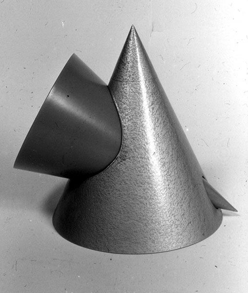 The model shows the penetration of two right cirular cones, whereas one cone can be pulled out in order to show the curve of intersection clearly.