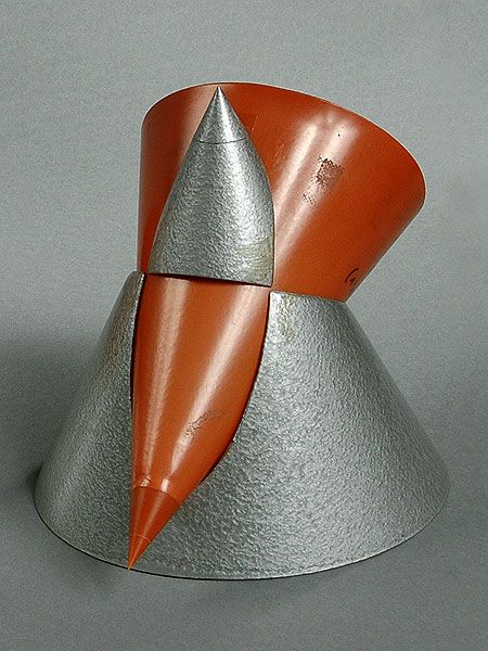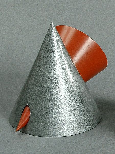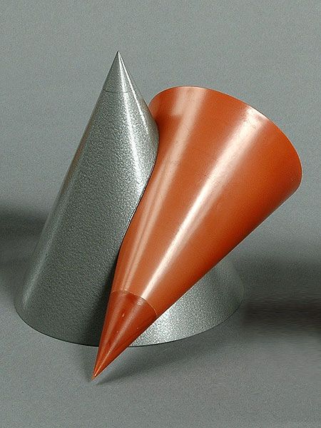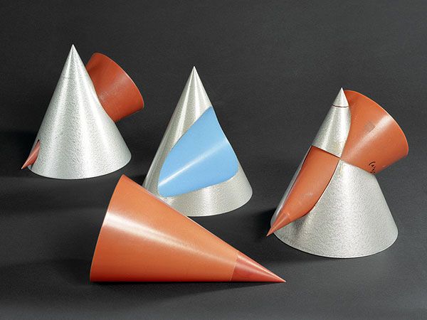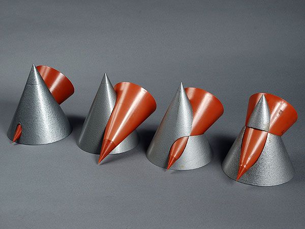 The models show the penetration of two right circular cones, where four different cases arise. In all these models one cone can be pulled out, in order to show quite clear the curve of intersection.""