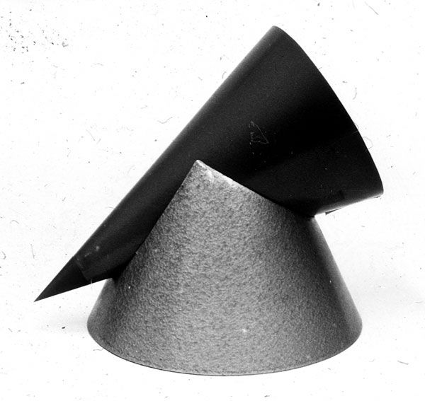 The model shows the penetration of two right circular cones whereas one of them can be pulled out in order to show the curve of intersection clearly.