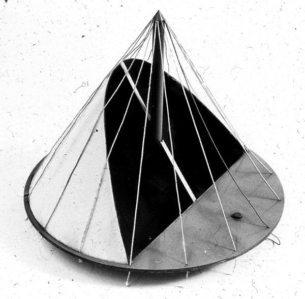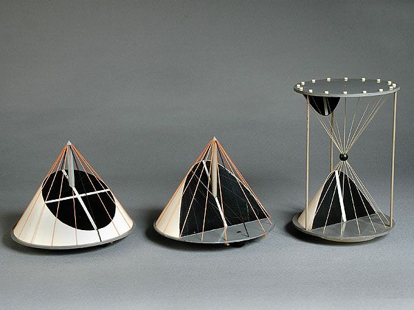 The intersection between a plane and circular cone (second-order cone) is always a curve of the second order. Multiple figures, that can have a conic section, of this model series are going through a rotary cone: ellipse, paraboloid and hyperbola. The appearance of the conic section depends on the angle between the intersection curve and the rotation axis, in relation to the opening angle of the rotary cone, which is the angle between the surface lines and the rotation axis.