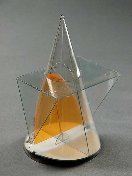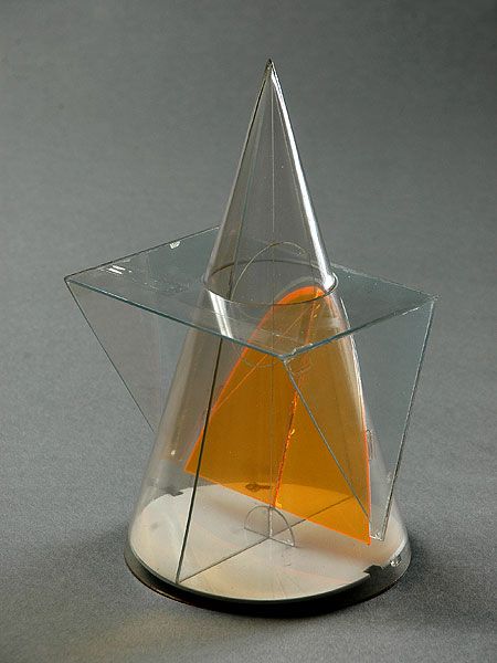 The model shows a cone of revolution and a section plane E that forms the same angle with the axis of revolution; it forms the cone's generator. Consequently, E intersects the cone of revolution along a parbola. Furthermore, the model shows the great circle of the Dandelin sphere, which contains the cone's axis of revolution and the focus of the parabola. The line segments required to derive the focus and directrix properties of the parabola are included in the model.