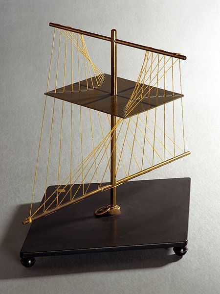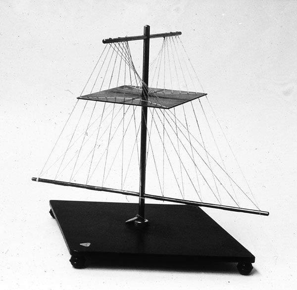 The model shows the position of the normals of the surface in the neighbourhood of a hyperbolic point. The normals are drawn from the points of the indicatrix hyperbola and intersect the axes of the two corresponding principal circles of curvature.