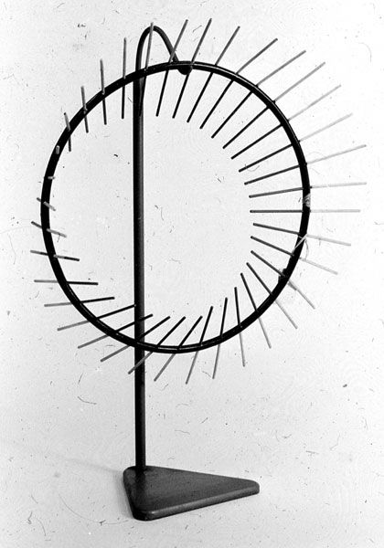 The model shows a one-sided ruled surface, generated by the movement of a straight line. There are given a circle k an a segment AB; AB is parallel to the axis of the circle and its centre M is situated on k (starting position). The plane through the axis of the circle rotates about this axis, and simultaneously AB rotates in this same plane about M such that the angle of the first rotation is twice the angle of the second rotation. In this way a ruled surface is generated, that is one-sided, because the segment AB, if M is in its original position, is rotated about 180°.