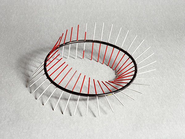 This one-sidedness in the model is illustrated by the red/white coloring of each segment, whereby the red pieces show the one part of the surface and the white pieces the other part and at some point the red part goes into the white part of the surface. Topologically this is a so-called Möbius strip.